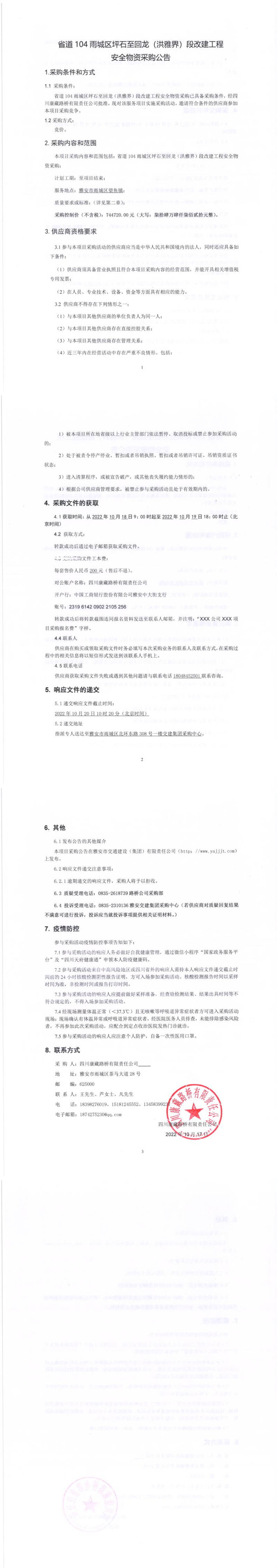 四川康藏路橋有限責(zé)任公司省道104雨城區(qū)坪石至回龍(洪雅界)段改建工程項(xiàng)目安全物資采購公告