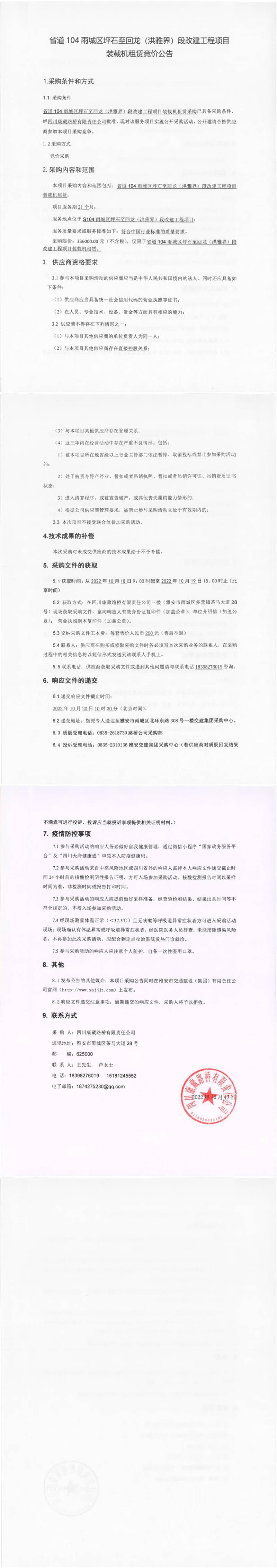 四川康藏路橋有限責(zé)任公司省道104雨城區(qū)坪石至回龍(洪雅界)段改建工程項(xiàng)目裝載機(jī)租賃競(jìng)價(jià)公告