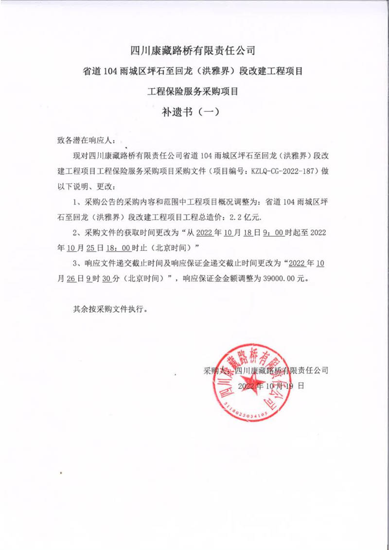 四川康藏路橋有限責(zé)任公司省道104雨城區(qū)坪石至回龍(洪雅界)段改建工程項(xiàng)目工程保險(xiǎn)服務(wù)采購(gòu)項(xiàng)目補(bǔ)遺書(一)