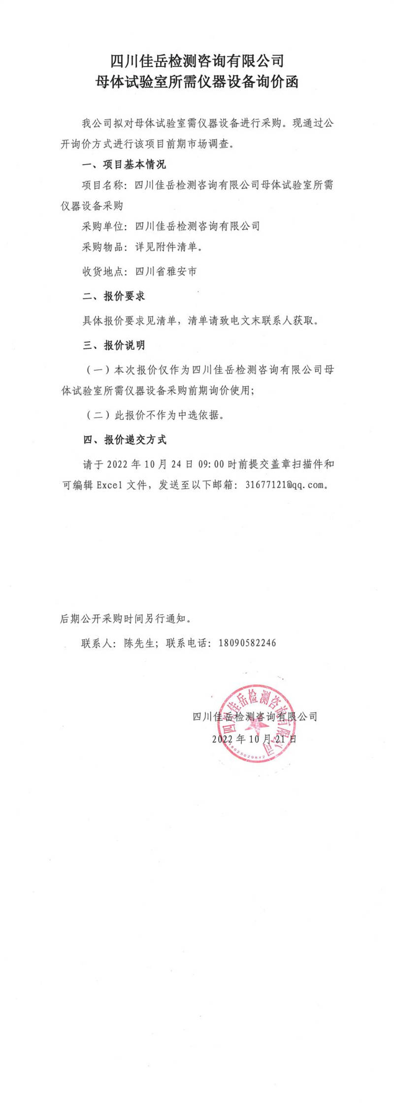 四川佳岳檢測咨詢有限公司母體試驗室所需儀器設(shè)備詢價函