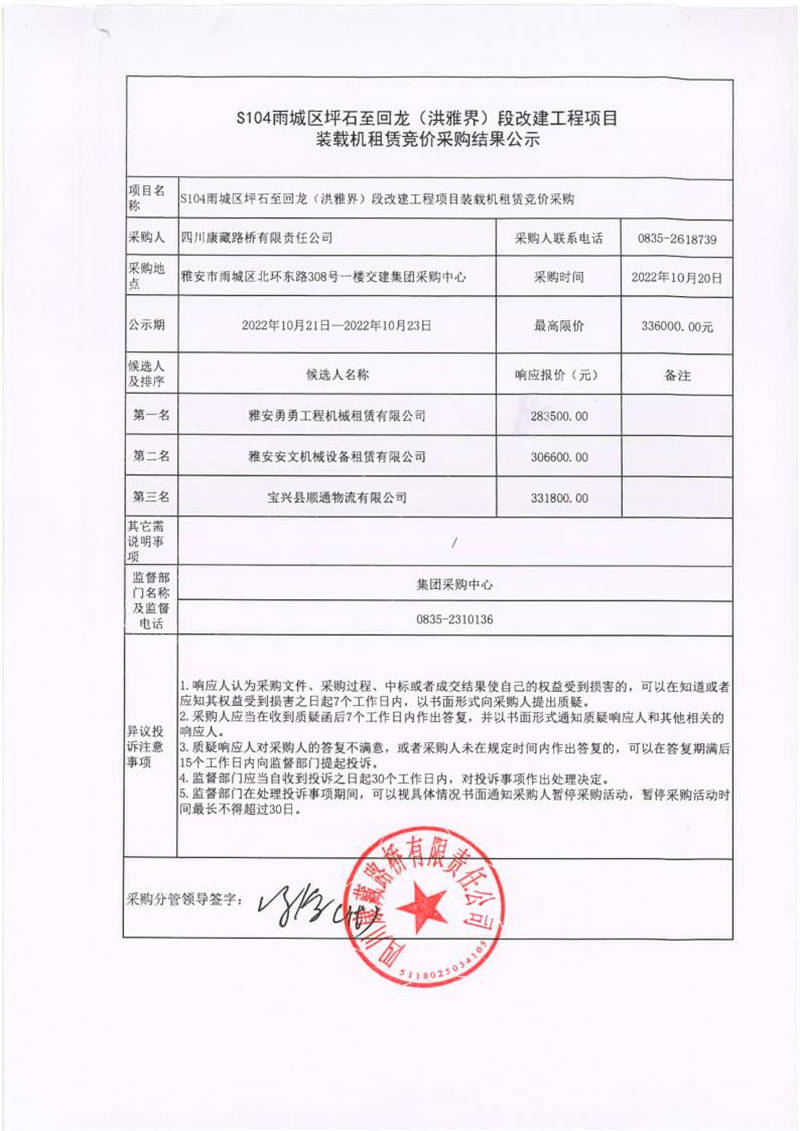 四川康藏路橋有限責任公司S104雨城區(qū)坪石至回龍(洪雅界)段改建工程項目裝載機租賃競價采購結果公示