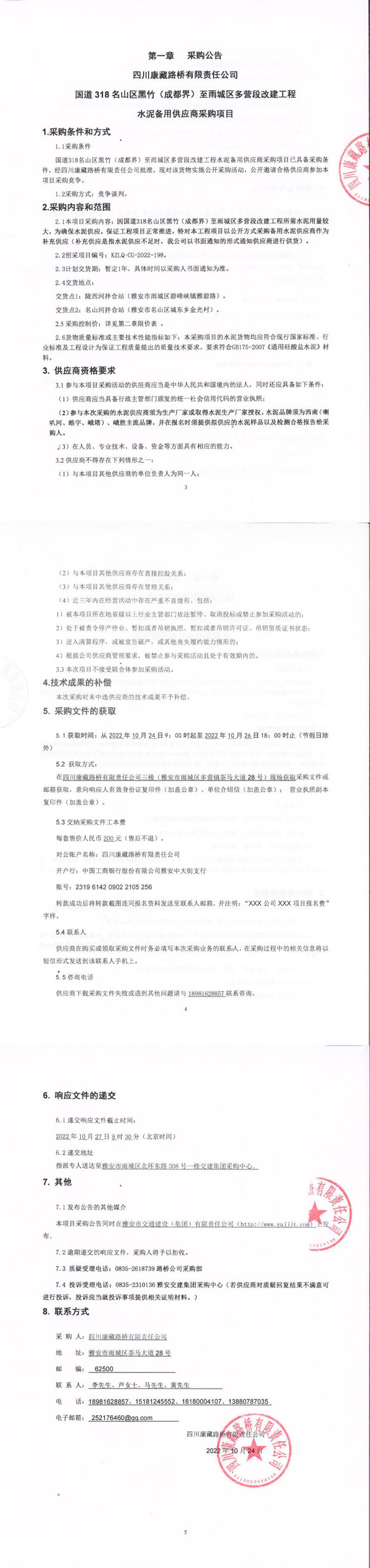 四川康藏路橋有限責(zé)任公司國道318名山區(qū)黑竹(成都界)至雨城區(qū)多營段改建工程水泥備用供應(yīng)商采購項目補遺書(一)