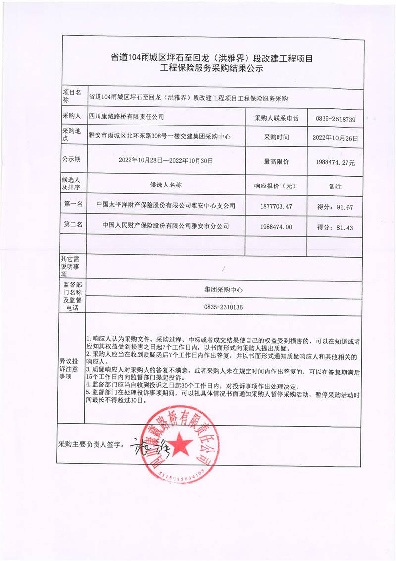 四川康藏路橋有限責任公司省道104雨城區(qū)坪石至回龍(洪雅界)段改建工程項目工程保險服務采購結(jié)果公示