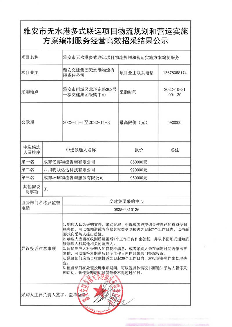雅安交建集團無水港物流有限責任公司雅安市無水港多式聯(lián)運項目物流規(guī)劃和營運實施方案編制服務經營高效招采結果公示