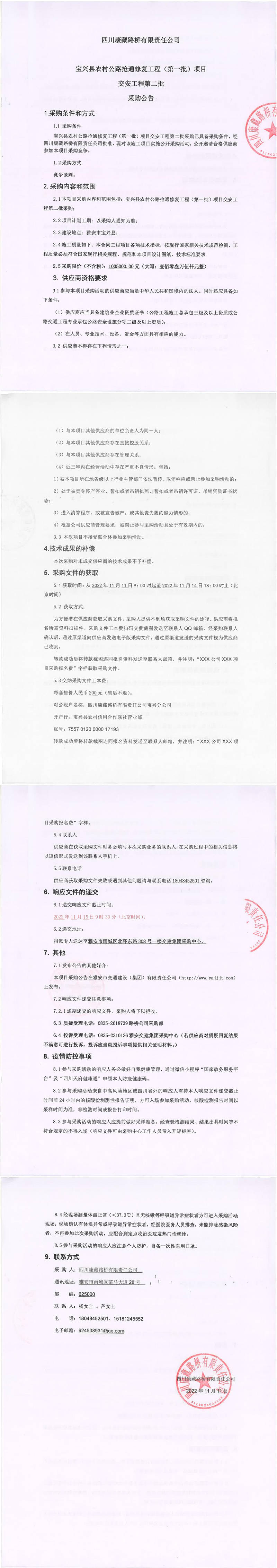 四川康藏路橋有限責任公司寶興縣農(nóng)村公路搶通修復工程(第一批)項目交安工程第二批采購公告