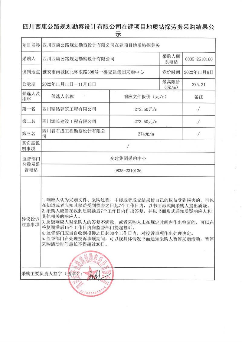 四川西康公路規(guī)劃勘察設計有限公司在建項目地質(zhì)鉆探勞務采購結果公示