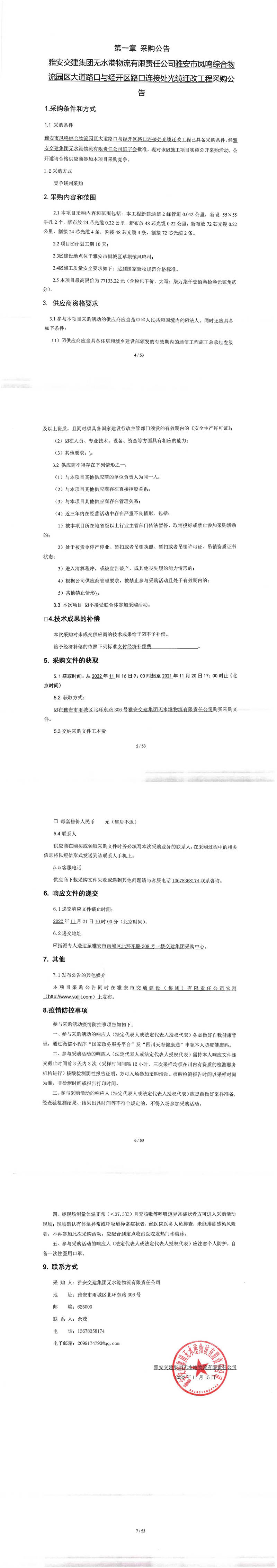 雅安交建集團無水港物流有限責任公司雅安市鳳鳴綜合物流園區(qū)大道路口與經開區(qū)路口連接處光纜遷改工程采購公告