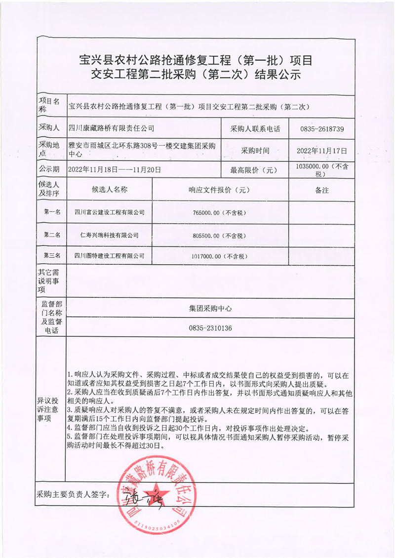 四川康藏路橋有限責(zé)任公司寶興縣農(nóng)村公路搶通修復(fù)工程(第一批)項(xiàng)目交安工程第二批采購(gòu)(第二次)結(jié)果公示