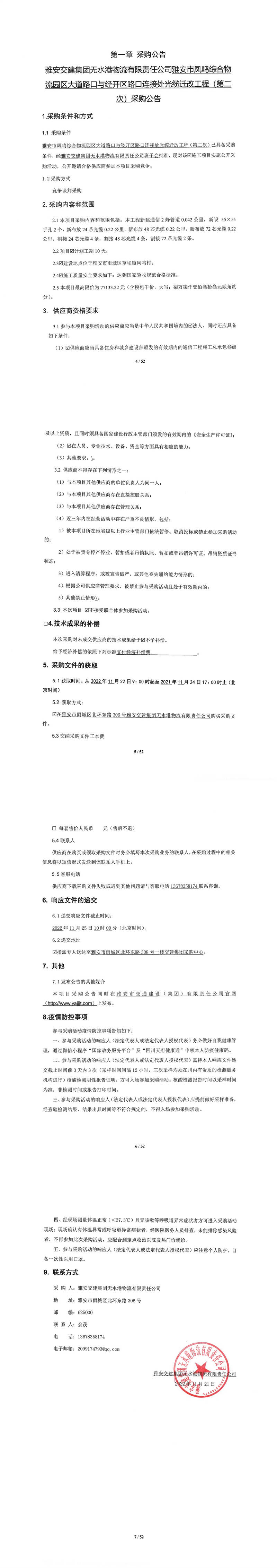 雅安交建集團無水港物流有限責任公司雅安市鳳鳴綜合物流園區(qū)大道路口與經(jīng)開區(qū)路口連接處光纜遷改工程(第二次)采購公告