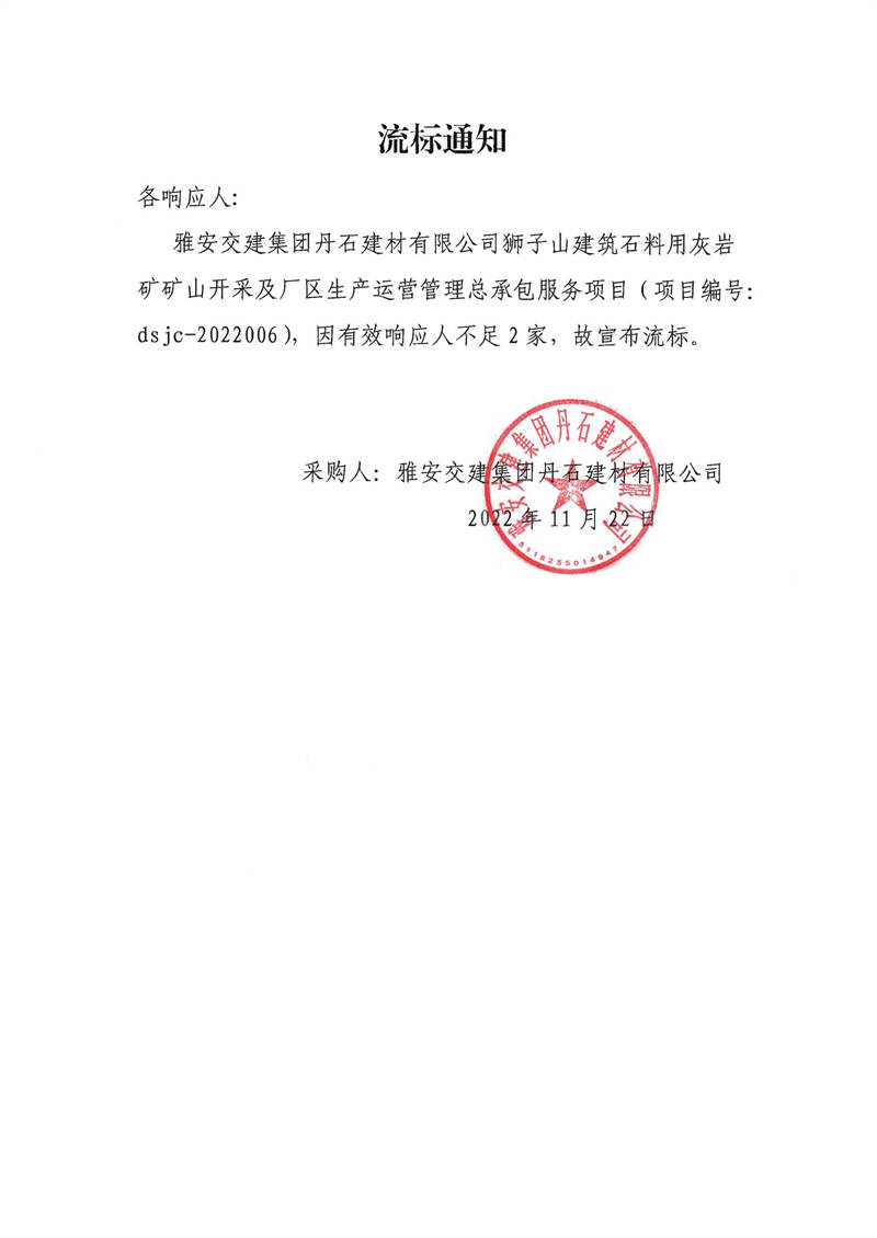 雅安交建集團(tuán)丹石建材有限公司獅子山建筑石料用灰?guī)r礦礦山開采及廠區(qū)生產(chǎn)運(yùn)營管理總承包服務(wù)項目采購流標(biāo)通知