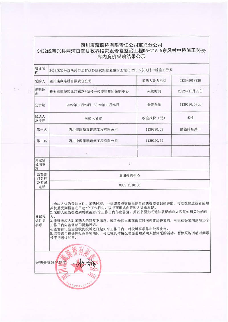 四川康藏路橋有限責任公司寶興分公司S432線寶興縣兩河口至甘孜界段災毀修復整治工程K5+216.5東風村中橋施工勞務(wù)庫內(nèi)競價采購結(jié)果公示
