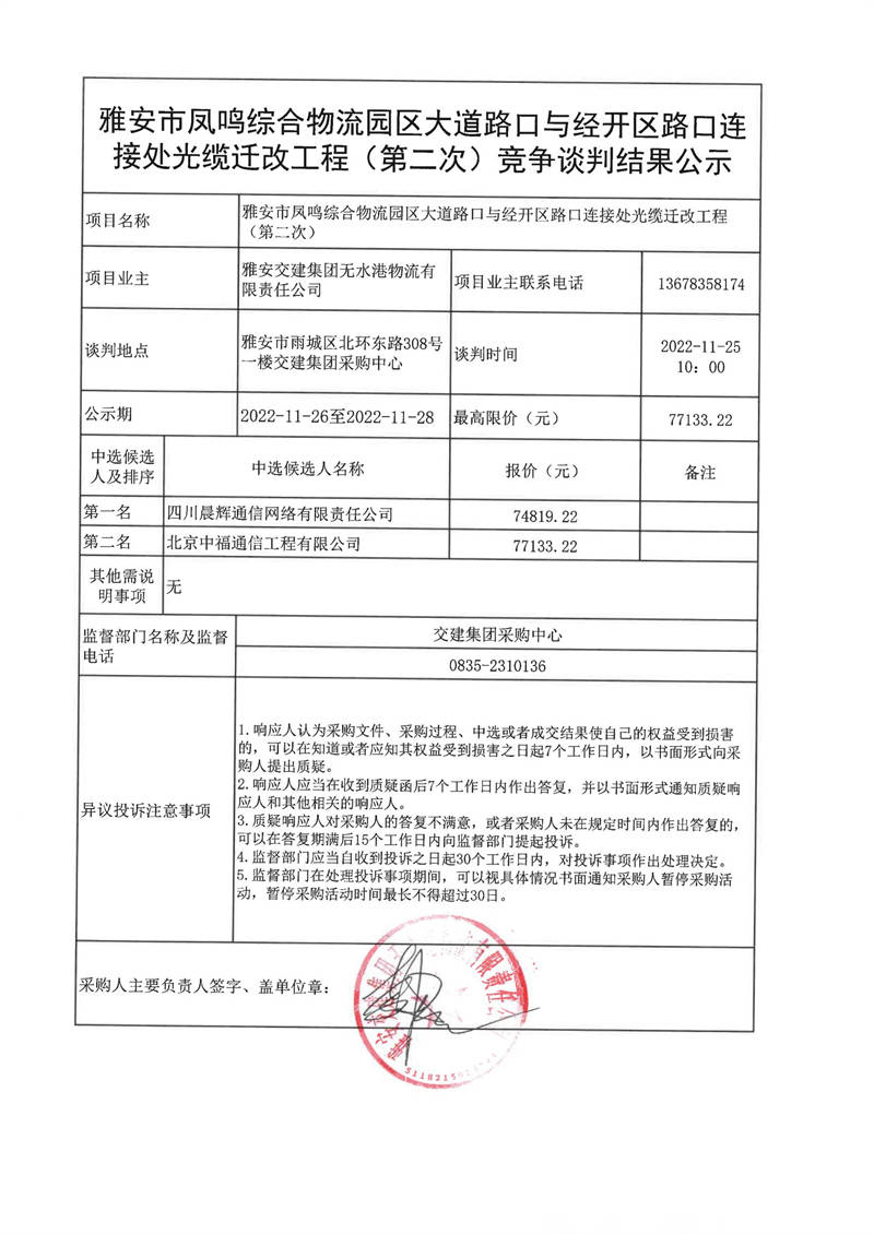 雅安交建集團無水港物流有限責任公司雅安市鳳鳴綜合物流園區(qū)大道路口與經開區(qū)路口連接處光纜遷改工程(第二次)競爭談判結果公示