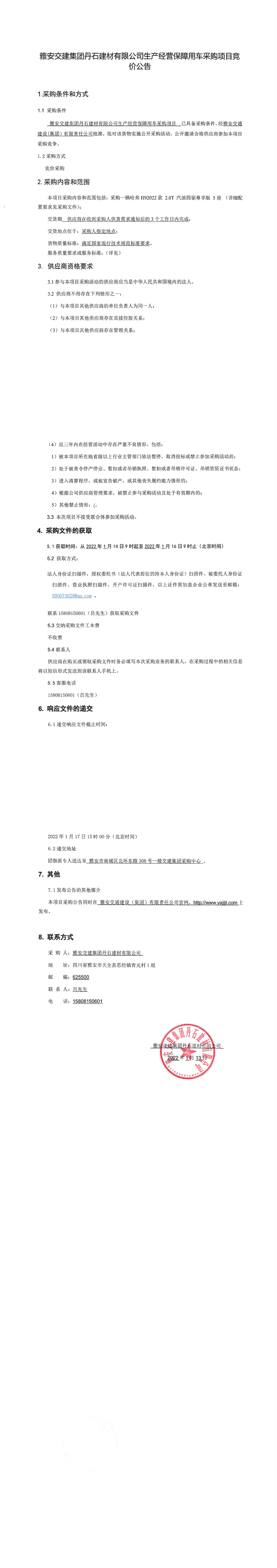 雅安交建集團(tuán)丹石建材有限公司生產(chǎn)經(jīng)營(yíng)保障用車采購(gòu)項(xiàng)目競(jìng)價(jià)公告