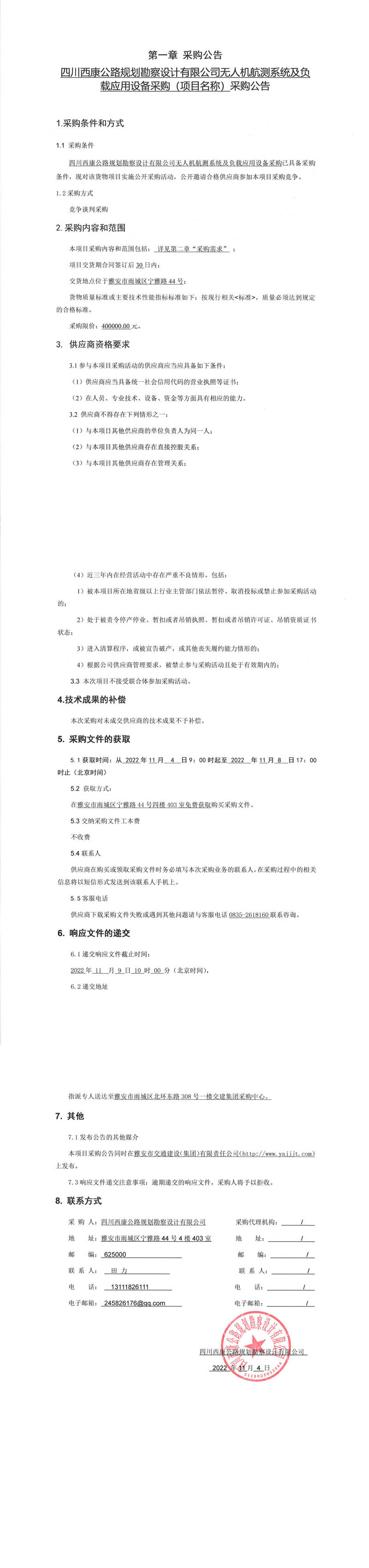 四川西康公路規(guī)劃勘察設(shè)計有限公司無人機航測系統(tǒng)及負(fù)載應(yīng)用設(shè)備采購(項目名稱)采購公告