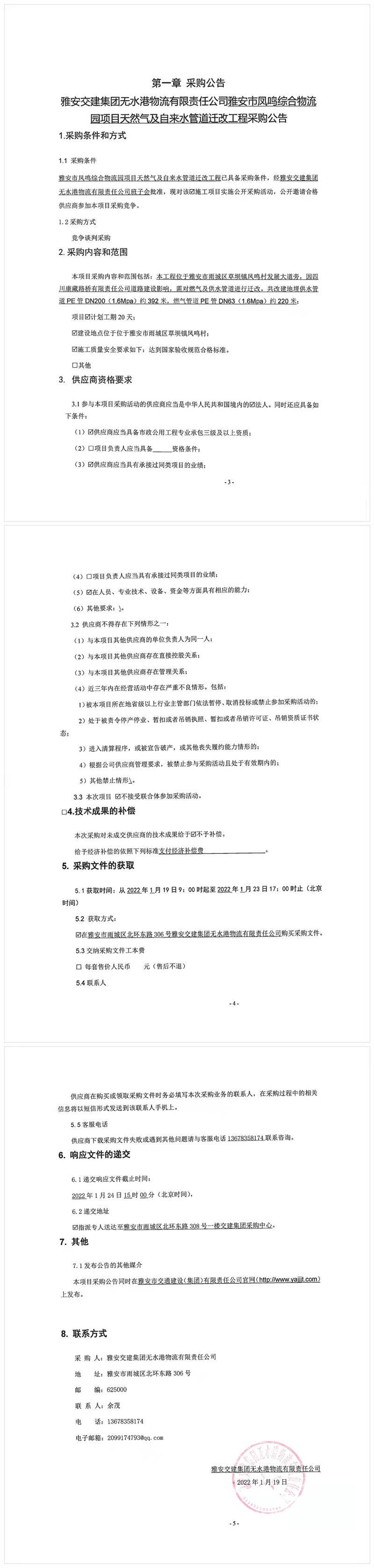 雅安交建集團無水港物流有限責(zé)任公司雅安市鳳鳴綜合物流園項目天然氣及自來水管道遷改工程采購公告