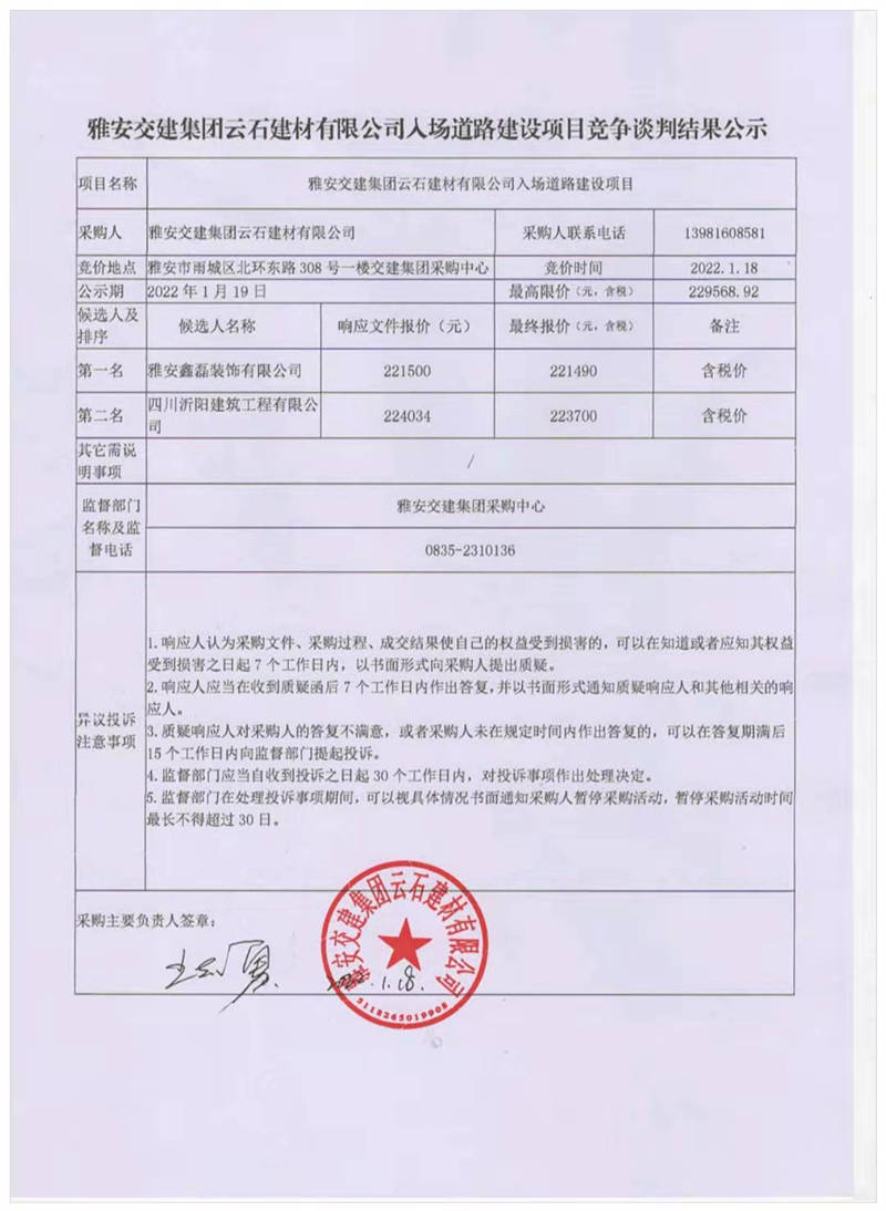 雅安交建集團(tuán)云石建材有限公司入場道路建設(shè)項(xiàng)目競爭談判結(jié)果公示