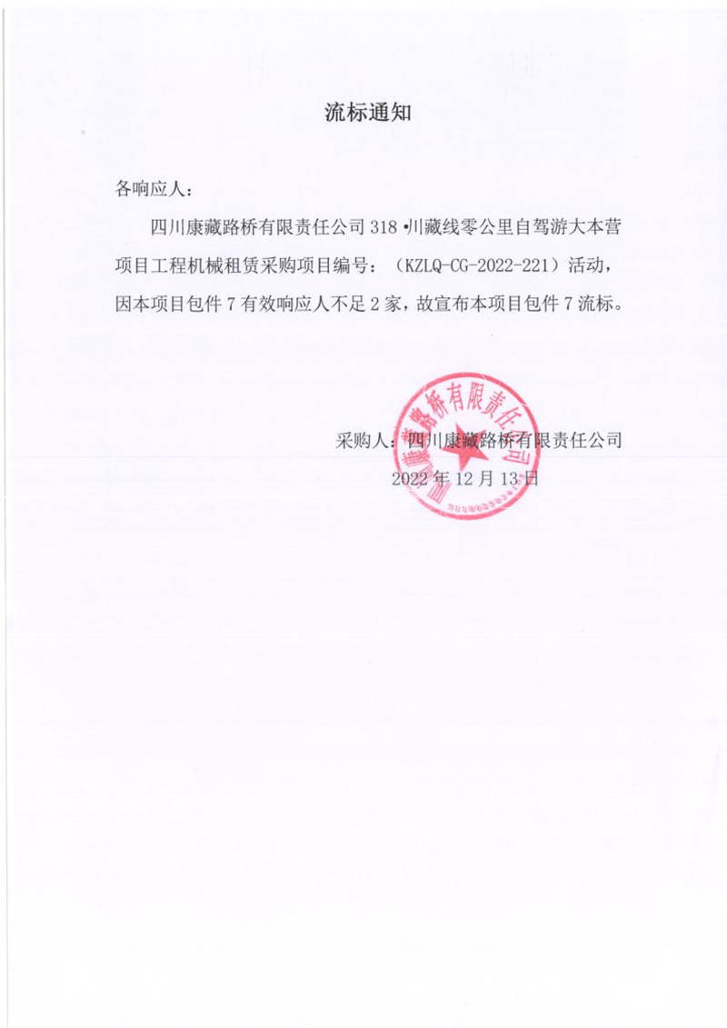 四川康藏路橋有限責(zé)任公司318.川藏線零公里自駕游大本營項(xiàng)目工程機(jī)械租賃采購(包件7)流標(biāo)通知