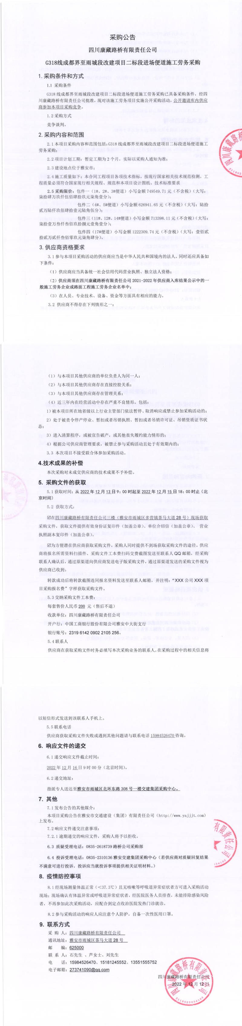 四川康藏路橋有限責(zé)任公司G318線成都界至雨城段新改建項目二標(biāo)段進(jìn)場便道施工勞務(wù)采購公告