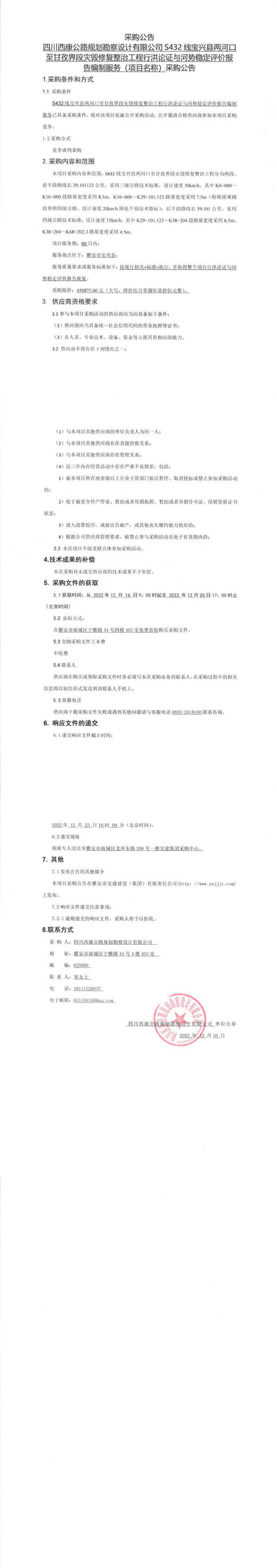四川西康公路規(guī)劃勘察設(shè)計(jì)有限公司S432線寶興縣兩河口至甘孜界段災(zāi)毀修復(fù)整治工程行洪論證與河勢穩(wěn)定評(píng)價(jià)報(bào)告編制服務(wù)(項(xiàng)目名稱)采購公告