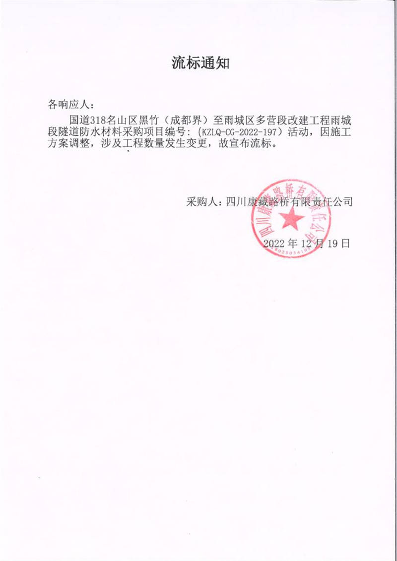 四川康藏路橋有限責任公司國道318名山區(qū)黑竹(成都界)至雨城區(qū)多營段改建工程雨城段隧道防水材料采購流標通知