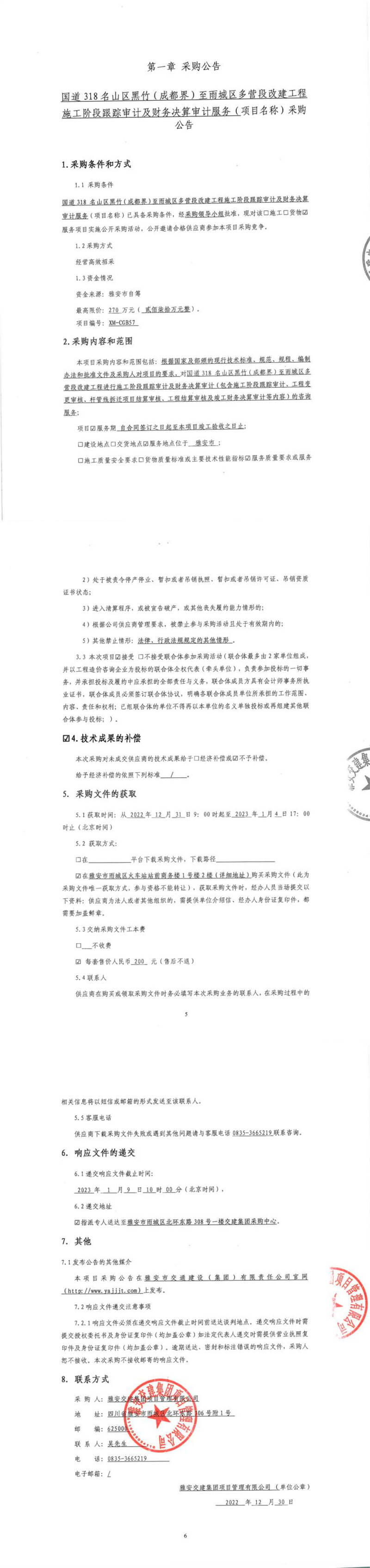 雅安交建集團(tuán)項(xiàng)目管理有限公司國道318名山區(qū)黑竹(成都界)至雨城區(qū)多營段改建工程施工階段跟蹤審計(jì)及財(cái)務(wù)決算審計(jì)服務(wù)采購公告