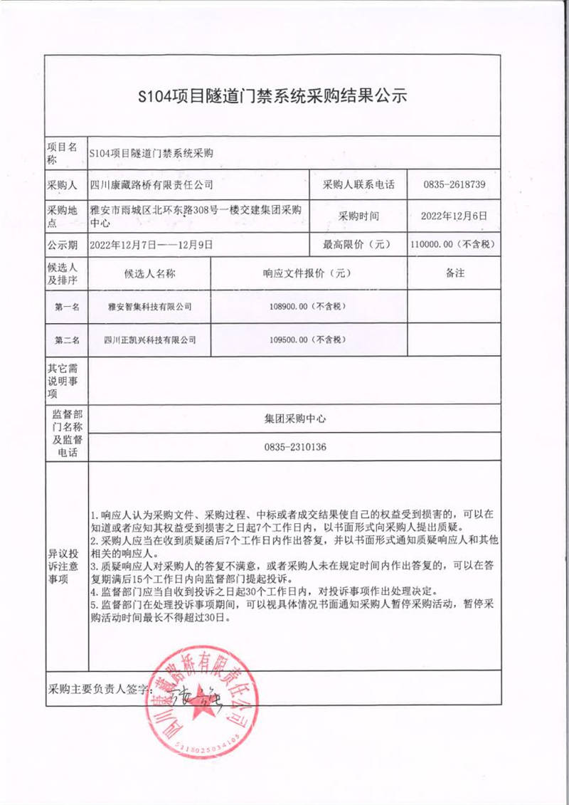 四川康藏路橋有限責任公司S104項目隧道門禁系統(tǒng)采購結果公示