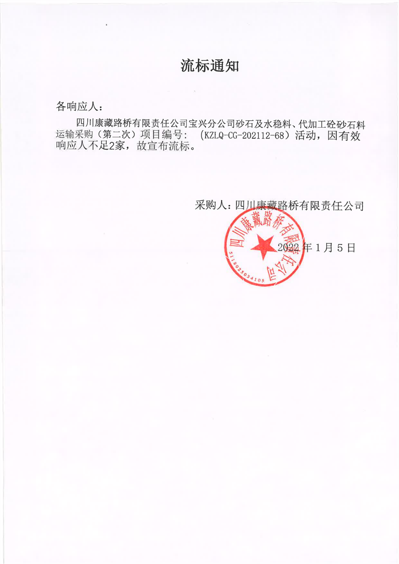 四川康藏路橋有限責(zé)任公司寶興分公司砂石及水穩(wěn)料、代加工砼砂石料運(yùn)輸采購(gòu)(第二次)流標(biāo)通知