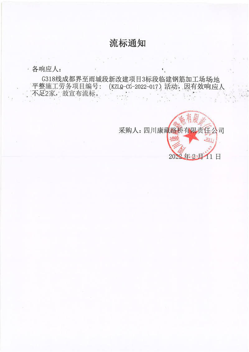 四川康藏路橋有限責(zé)任公司G318線成都界至雨城段新改建項目3標段臨建鋼筋加工場場地平整施工勞務(wù)項目流標通知