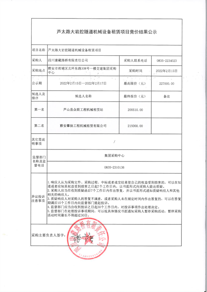 四川康藏路橋有限責任公司蘆太路大巖腔隧道機械設備租賃項目競價結(jié)果公示