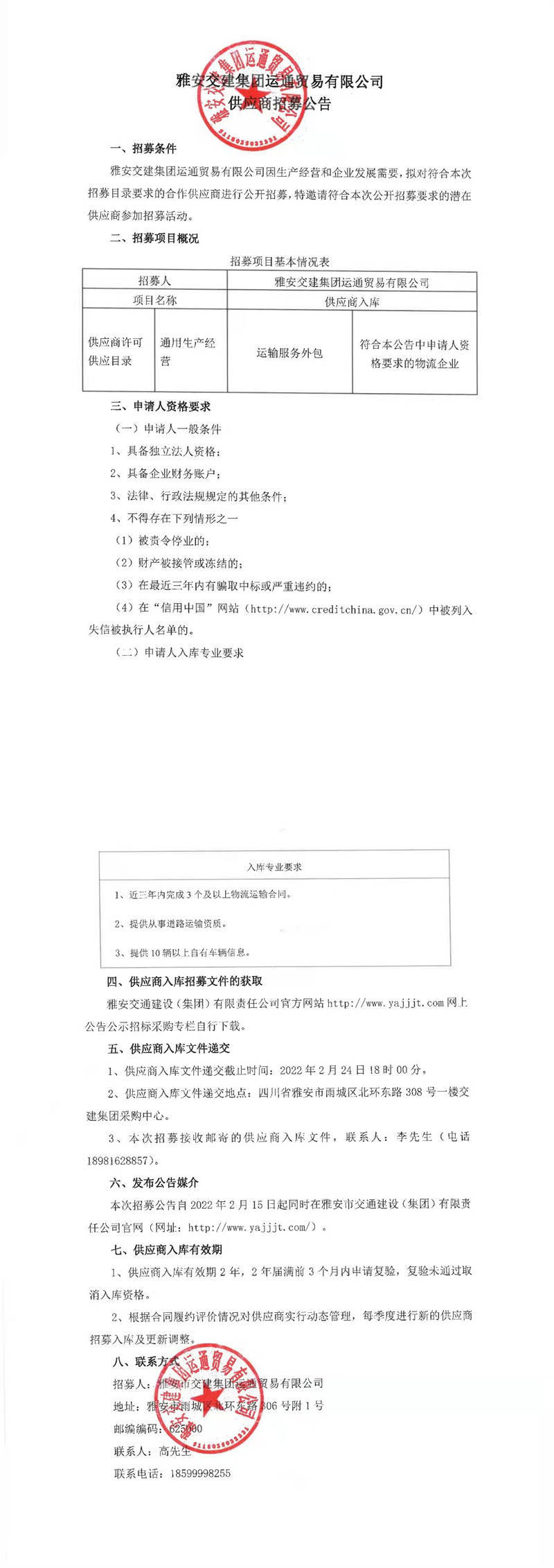 雅安交建集團(tuán)運通貿(mào)易有限公司供應(yīng)商招募公告
