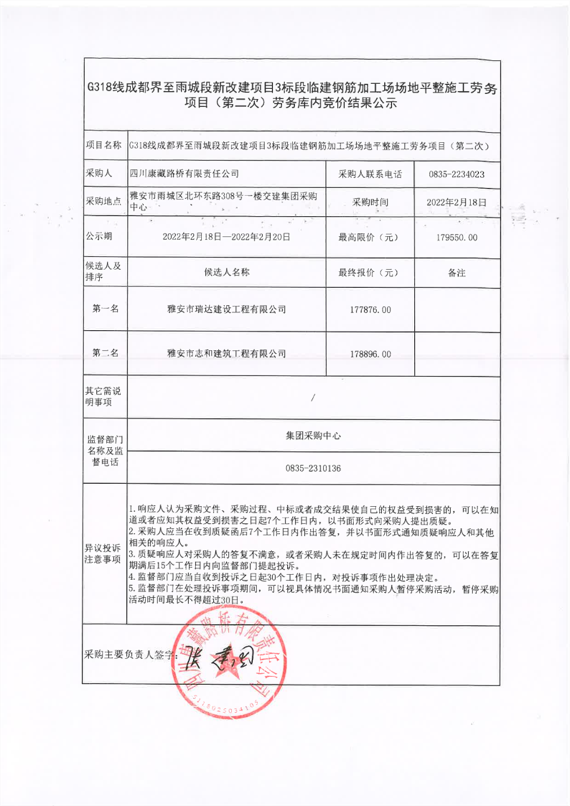 四川康藏路橋有限責任公司G318線成都界至雨城段新改建項目3標段臨建鋼筋加工場場地平整施工勞務(wù)(第二次)庫內(nèi)競價結(jié)果公示