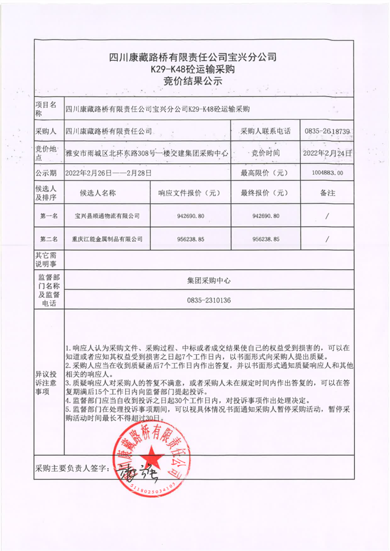 四川康藏路橋有限責(zé)任公司寶興分公司K29-K48砼運(yùn)輸采購(gòu)競(jìng)價(jià)結(jié)果公示