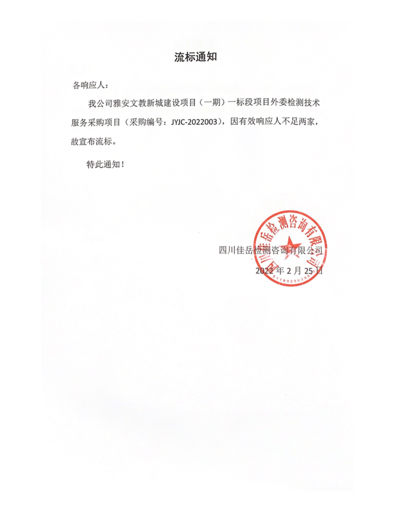 四川佳岳檢測咨詢有限公司雅安文教新城國際社區(qū)蜀天星辰項目(一期)外委檢測服務采購項目流標通知