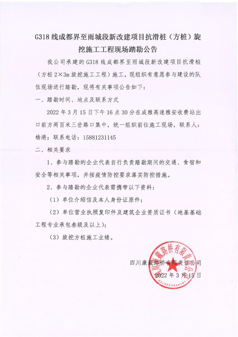 四川康藏路橋有限責(zé)任公司G318線成都界至雨城段新改建項(xiàng)目抗滑樁(方樁)旋挖施工工程現(xiàn)場踏勘公告