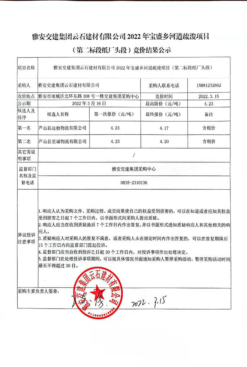 雅安交建集團(tuán)云石建材有限公司2022年寶盛鄉(xiāng)河道疏浚項(xiàng)目(第二標(biāo)段紙廠頭段)競價結(jié)果公示