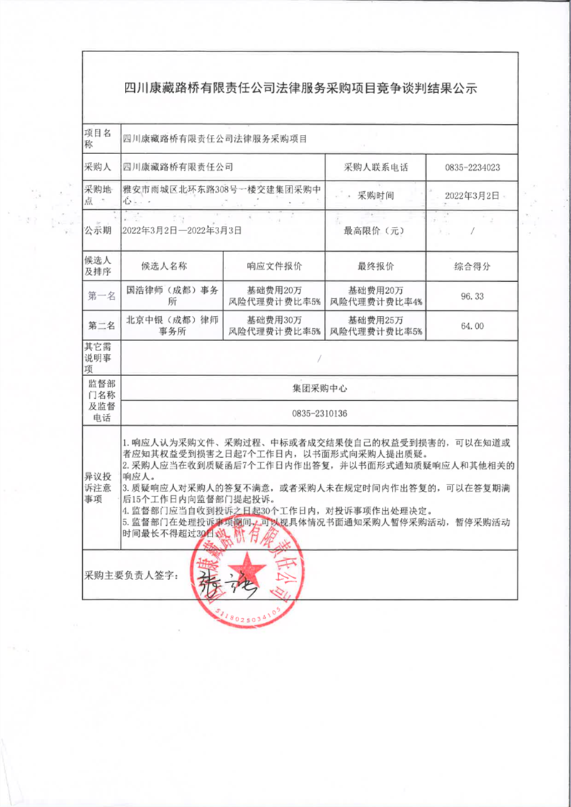 四川康藏路橋有限責(zé)任公司法律服務(wù)采購項(xiàng)目競(jìng)爭(zhēng)談判結(jié)果公示