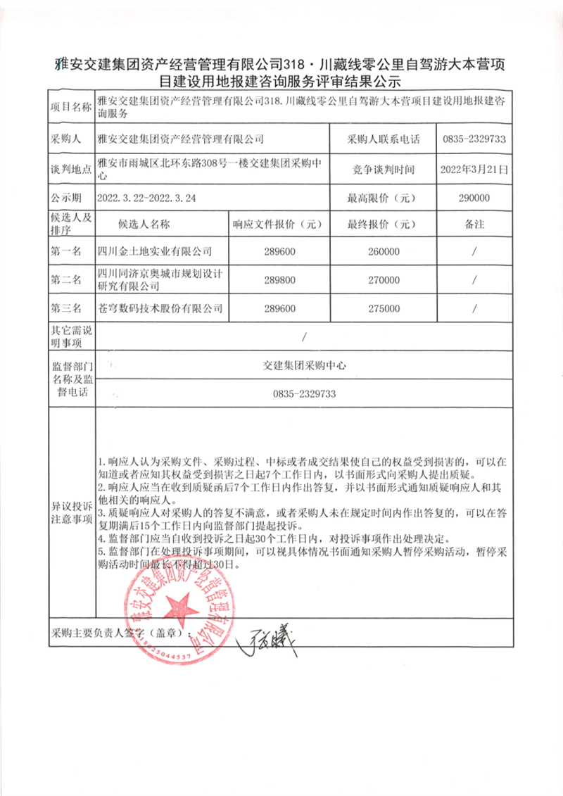雅安交建集團(tuán)資產(chǎn)經(jīng)營管理有限公司318川藏線零公里自駕游大本營項(xiàng)目建設(shè)用地報(bào)建咨詢服務(wù)評審結(jié)果公示