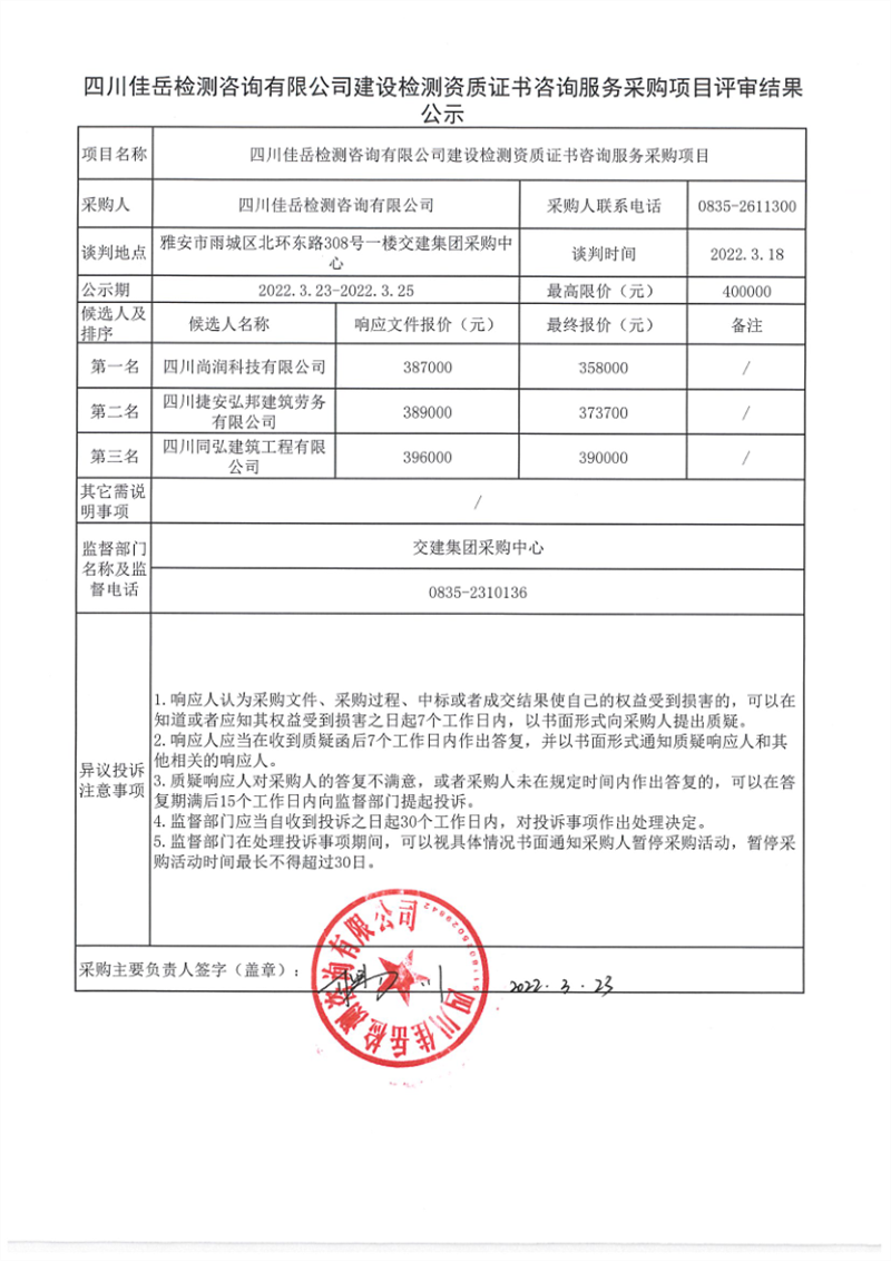 四川佳岳檢測咨詢有限公司建設檢測資質(zhì)證書咨詢服務采購項目評審結果公示