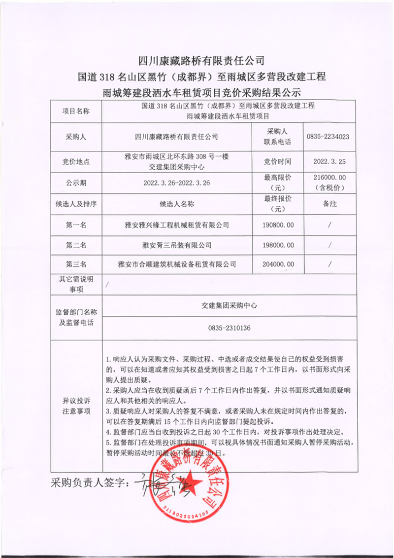 四川康藏路橋有限責(zé)任公司國(guó)道318名山區(qū)黑竹(成都界)至雨城區(qū)多營(yíng)段改建工程雨城籌建段灑水車租賃項(xiàng)目競(jìng)價(jià)采購結(jié)果公示
