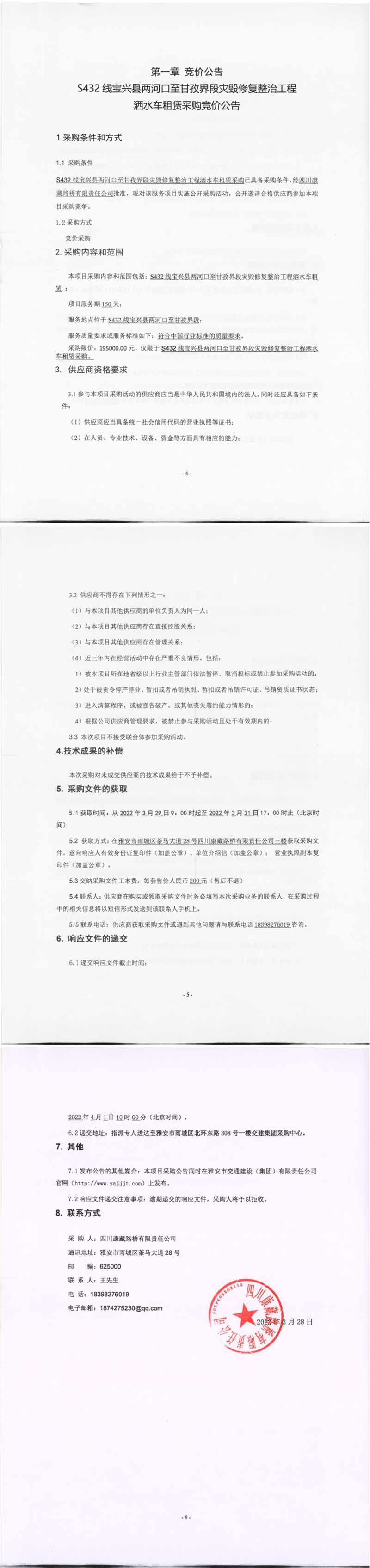 四川康藏路橋有限責(zé)任公司S432線寶興縣兩河口至甘孜界段災(zāi)毀修復(fù)整治工程灑水車租賃采購競(jìng)價(jià)公告