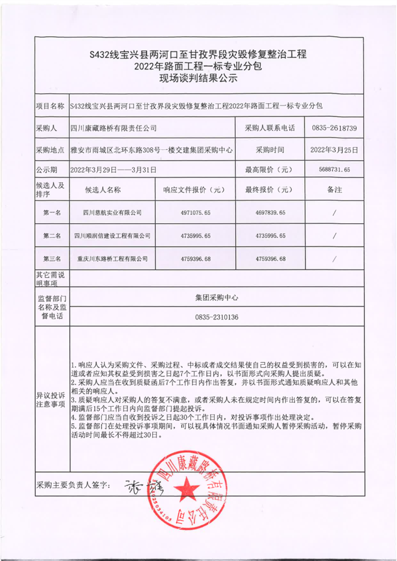 四川康藏路橋有限責(zé)任公司S432線寶興縣兩河口至甘孜界段災(zāi)毀修復(fù)整治工程2022年路面工程一標(biāo)專業(yè)分包現(xiàn)場談判結(jié)果公示