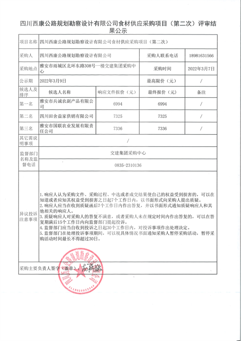 四川西康公路規(guī)劃勘察設計有限公司食材供應采購項目(第二次)評審結(jié)果公示