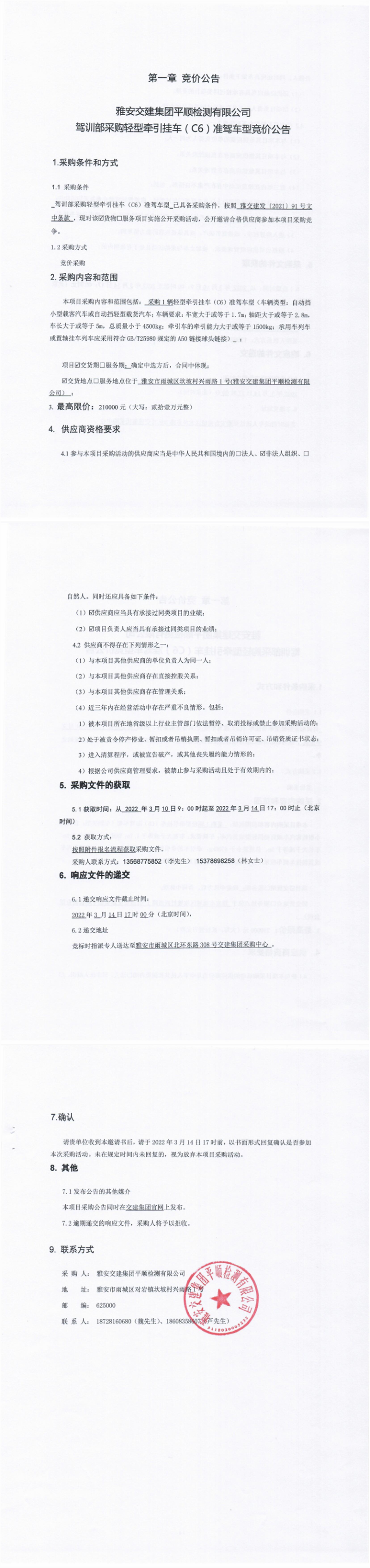 雅安交建集團平順檢測有限公司駕訓(xùn)部采購輕型牽引掛車(C6)準(zhǔn)駕車型競價公告