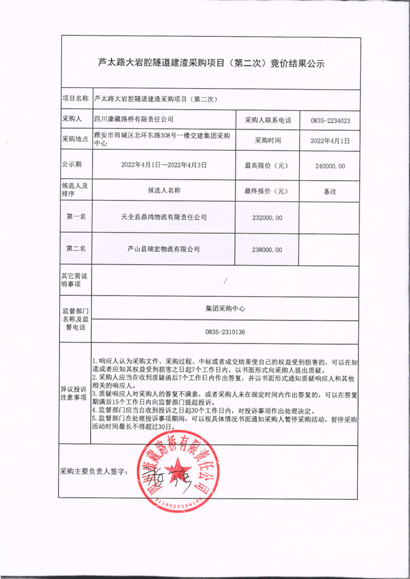 四川康藏路橋有限責任公司蘆太路大巖腔隧道建渣采購項目(第二次)競價結果公示