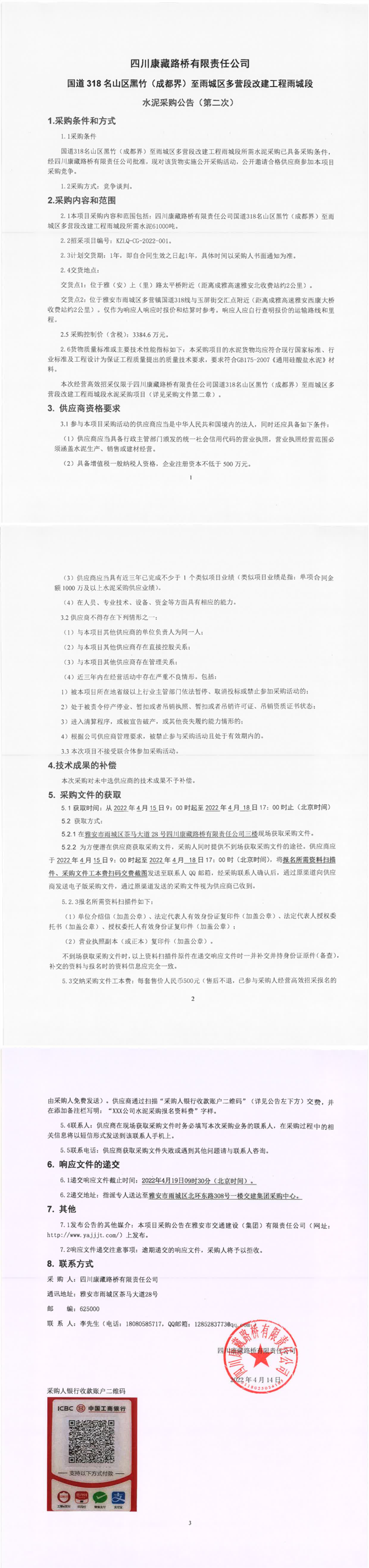 四川康藏路橋有限責任公司國道318名山區(qū)黑竹(成都界)至雨城區(qū)多營段改建工程雨城段水泥采購公告(第二次)