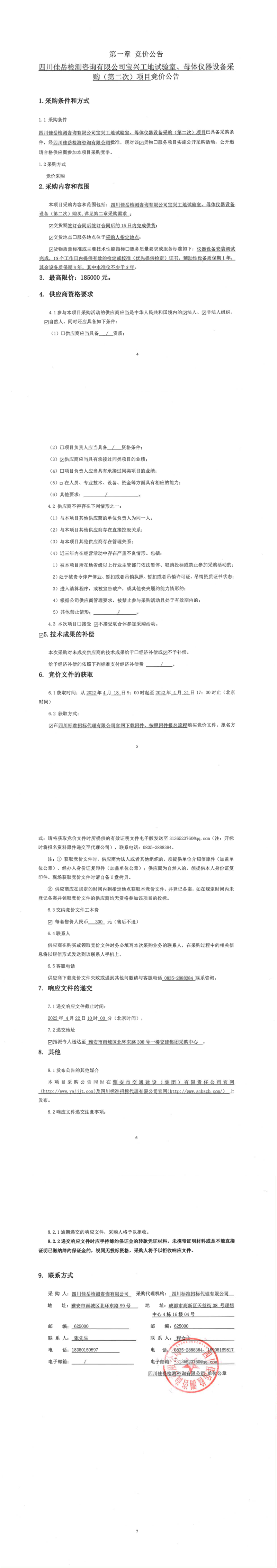 四川佳岳檢測(cè)咨詢有限公司寶興工地試驗(yàn)室、母體儀器設(shè)備采購(第二次)項(xiàng)目競(jìng)價(jià)公告