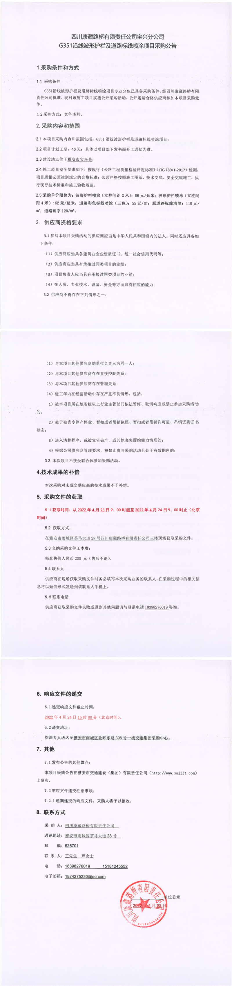 四川康藏路橋有限責(zé)任公司寶興分公司G351沿線波形護(hù)欄及道路標(biāo)線噴涂項目采購公告