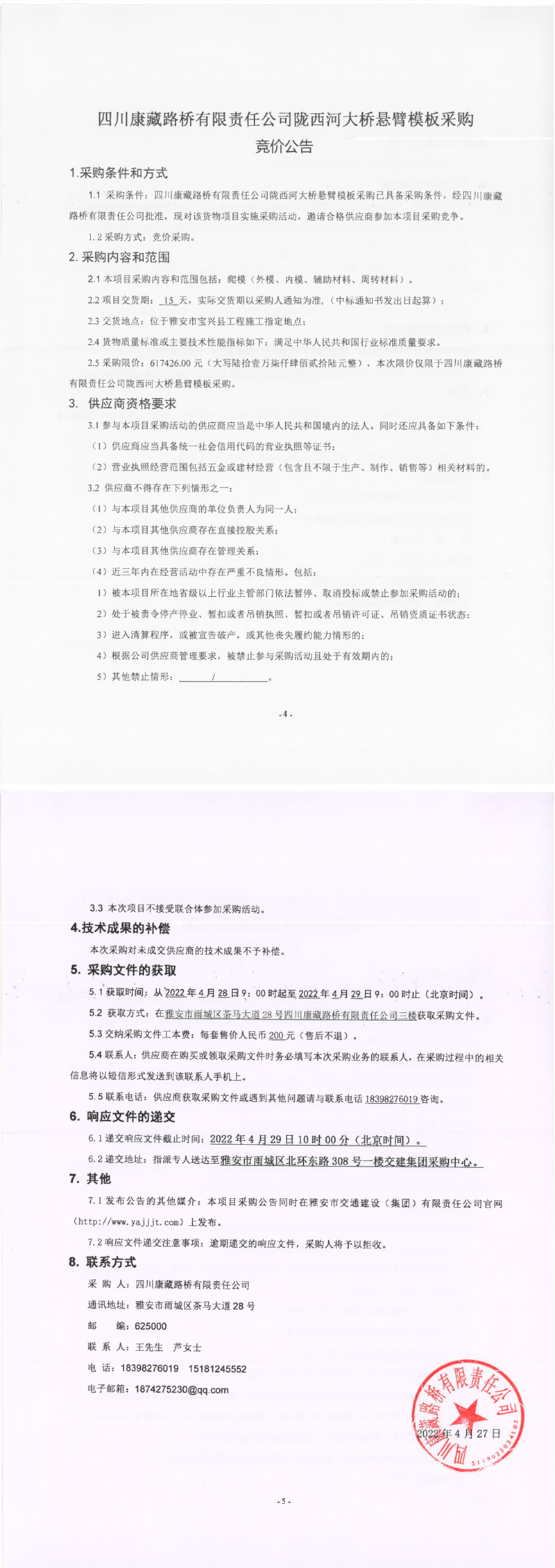 四川康藏路橋有限責(zé)任公司隴西河大橋懸臂模板采購競價(jià)公告