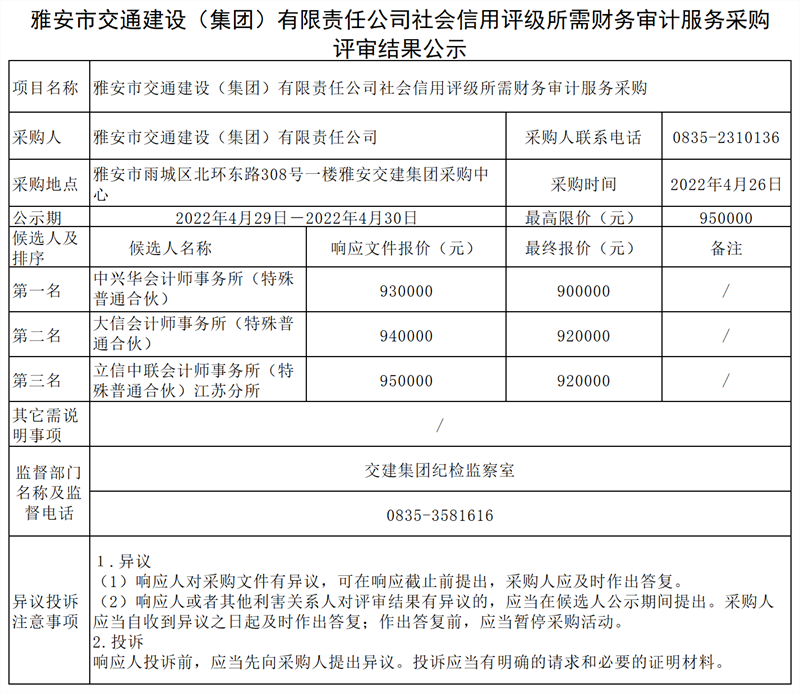 雅安市交通建設(集團)有限責任公司社會信用評級所需財務審計服務采購評審結果公示