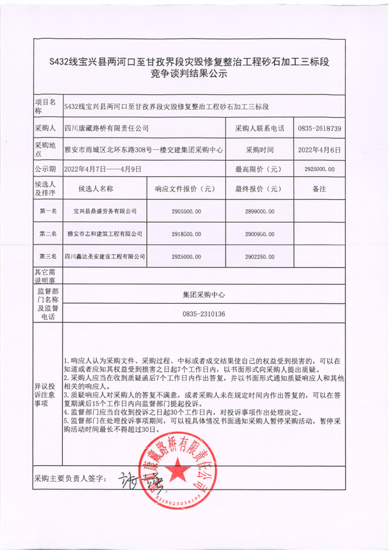 四川康藏路橋有限責(zé)任公司S432線寶興縣兩河口至甘孜界段災(zāi)毀修復(fù)整治工程砂石加工三標(biāo)段競爭談判結(jié)果公示